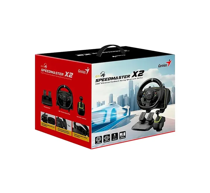 Volante de juegos Genius SpeedMaster X2 / rotación 1080° / vibración doble motor / empuñadura goma / 2*levas traseras / Palanca cambios / 2*Pedales / interfaz: USB / Compatible: PS3, PS4, Xbox Series X, Xbox One, Xbox 360, Windows |
