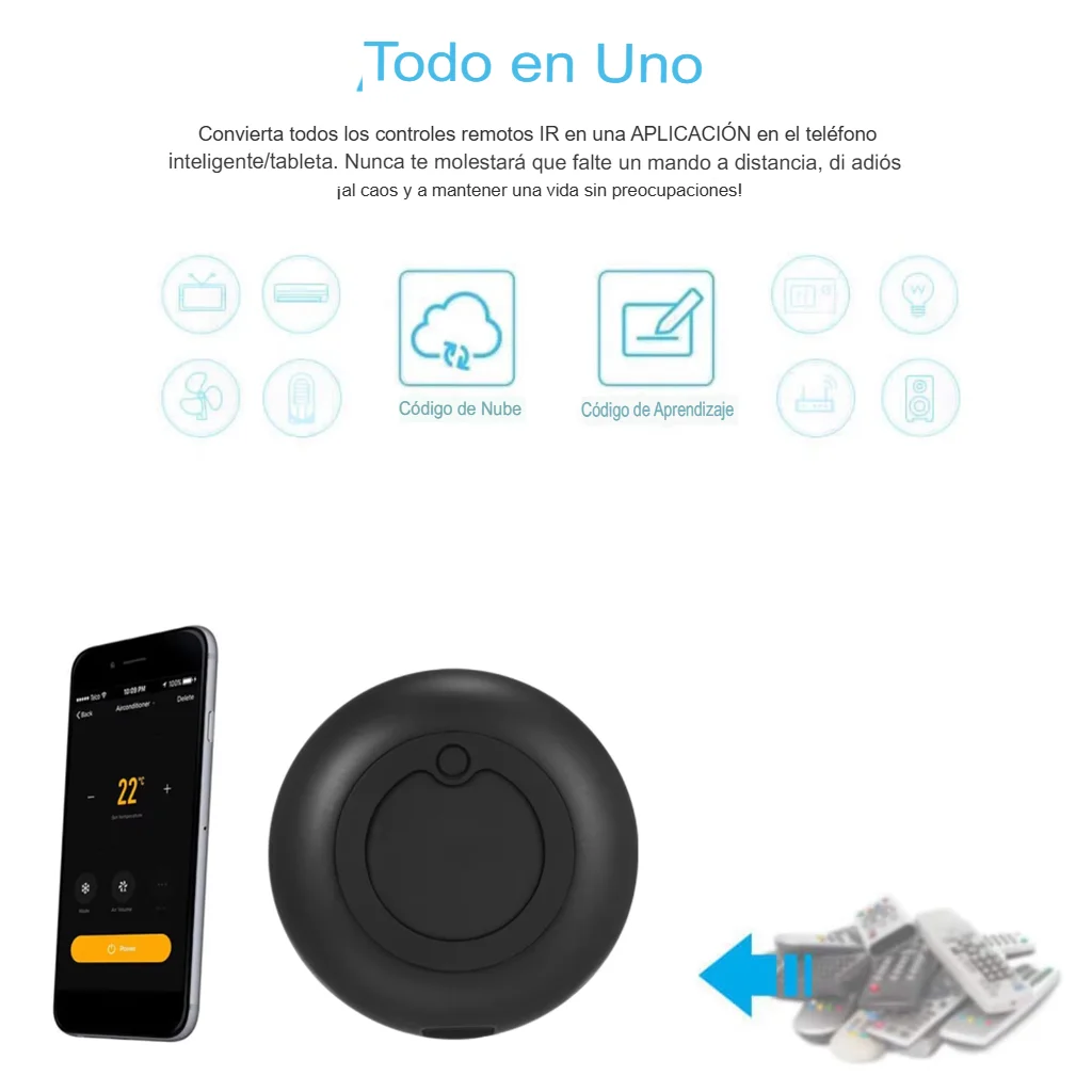 | Descripción General | - Control de aplicaciones Controle los dispositivos de infrarrojos con la aplicación Tuya Smart o la aplicación Smart Life en cualquier lugar y en cualquier momento. Convierta sus dispositivos domésticos básicos en dispositivos inteligentes y haga la vida más inteligente y conveniente.