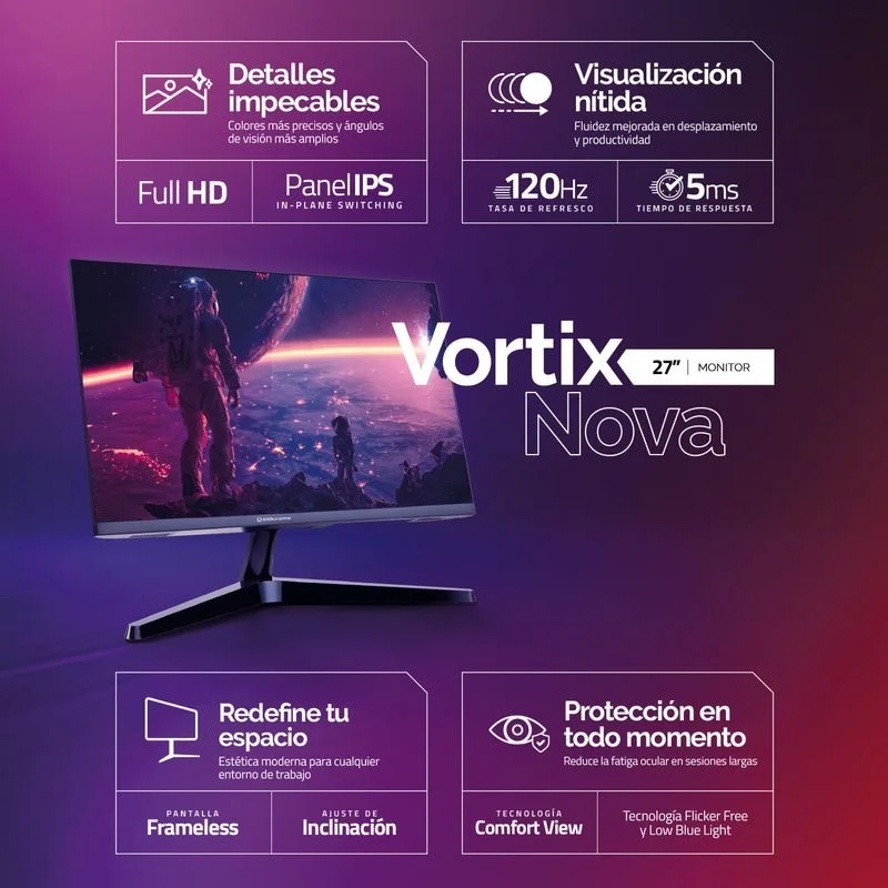 | Características destacadas | - Nuestros monitores de 27 pulgadas de la línea Vortix Nova combinan tecnología y elegancia en un diseño frameless perfecto para multitareas, gaming o diseño. Esta pantalla de 27 pulgadas ofrece resolución Full HD, tasa de 120Hz y panel IPS, brindando colores nítidos y amplios ángulos de visión.