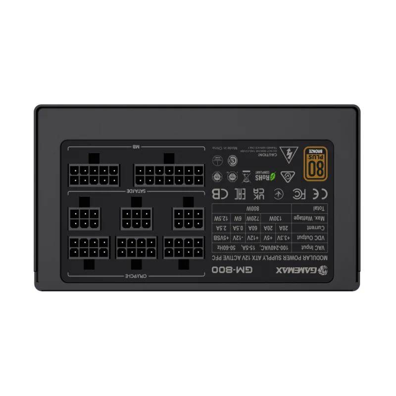 Especificaciones de la PSU | ENTRADA DE VCA: 100-240 V CA, 15-5 A, 50-60 Hz | Salida VCC | +3,3 V | +5V | +12V | -12V | +5VSB | Corriente | 20A | 20A | 60 A | 0.5A | 2.5A | Potencia maxima | 130W | 720W | 6W | 12,5 W | Salida máxima | 800W | |
