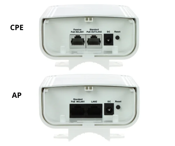- Puerto PoE AP: ENTRADA PoE 802.3af/at LAN1; CPE: ENTRADA PoE pasiva LAN1, SALIDA PoE 802.3 af LAN2