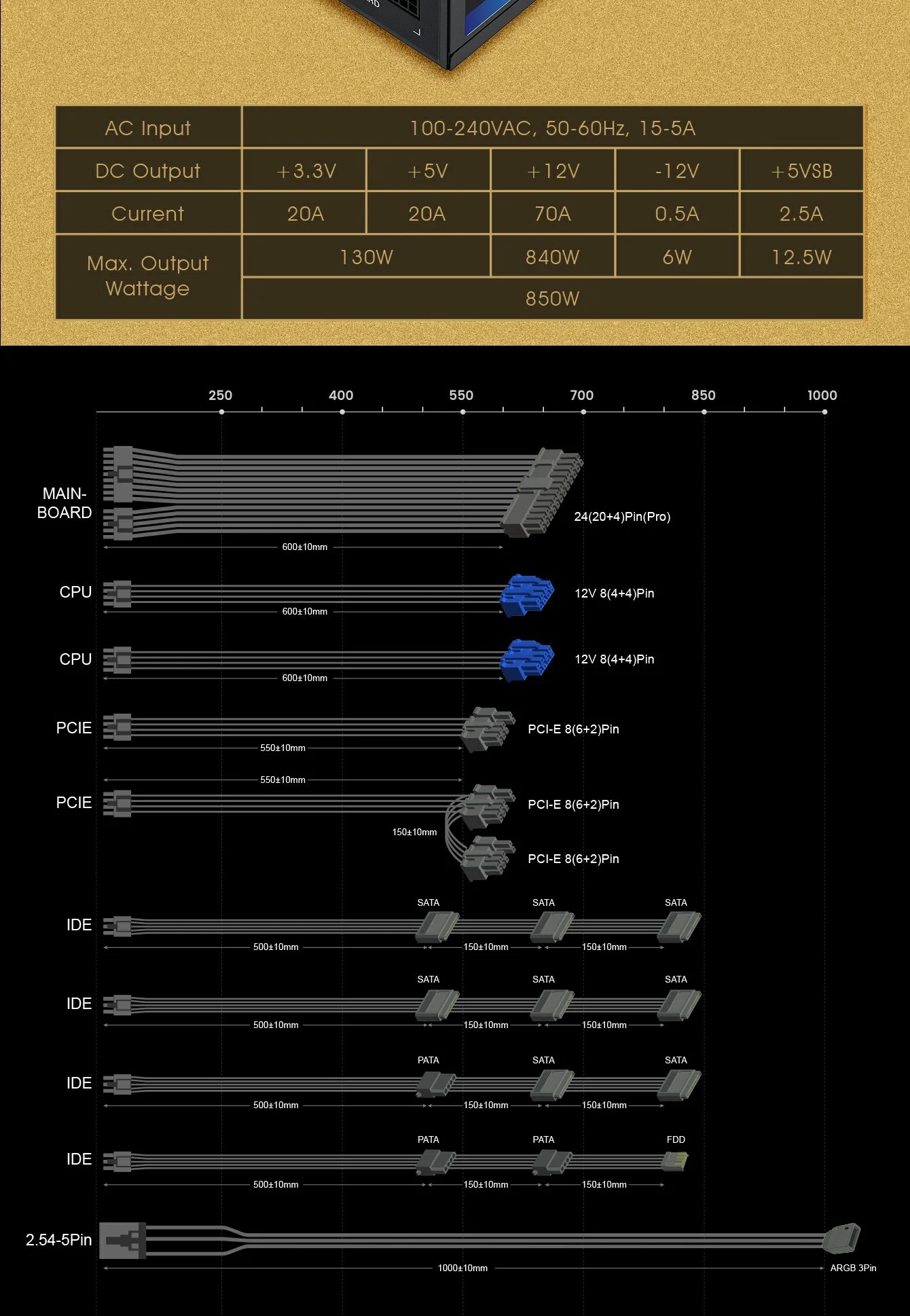 - Certificación 80 Plus Gold: El RGB-850 PRO utiliza condensadores japoneses principales, con una eficiencia del 90% o superior en cargas típicas.