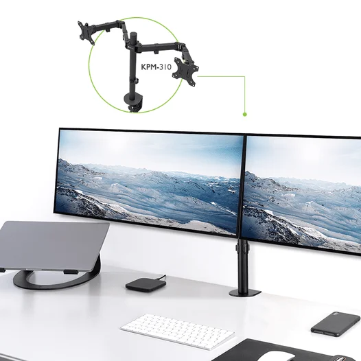 | Soporte de Escritorio para 2 monitores KLIPXTREME KPM-310 de 13 a 32" / rotación de 360° / Inclinación de movimiento completo 90° / Ajustable en mesa / Compatible VESA: 75x75 y 100x100 / black |