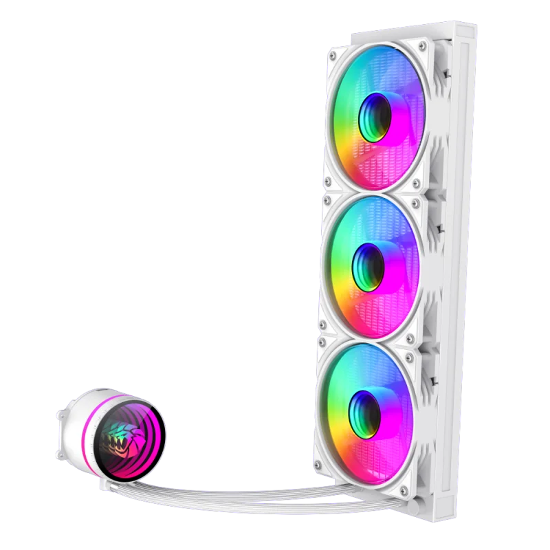 - VENTILADORES ARGB TRIPLES: 3 ventiladores ARGB PWM de 120 mm brindan una excelente presión y flujo de aire al tiempo que generan muy poco ruido. (Nota: El modo PWM debe configurarse en BOIS antes del funcionamiento del enfriador líquido; de lo contrario, el ventilador funcionará a una velocidad fija de velocidad completa o baja velocidad)