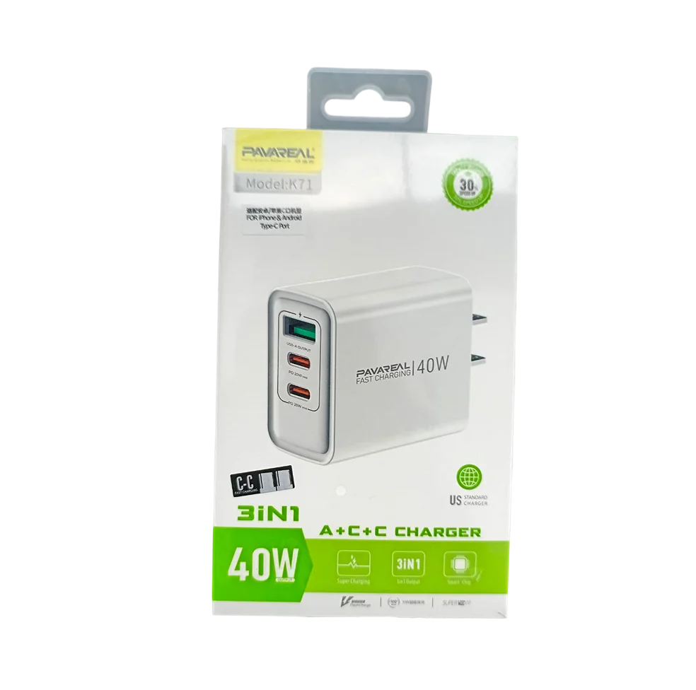 Cargador de pared Pavareal K71 3EN1 (1*USB-A + 2*USB-C) 40W (Carga rápida) / incl. Cable USB-C