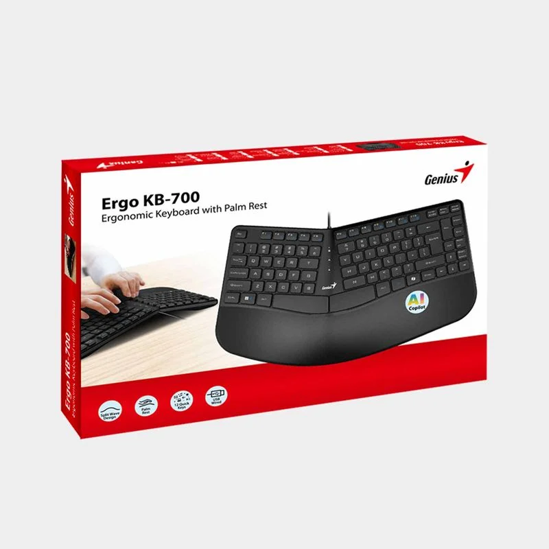 Teclado Genius Ergo KB-700 / Ergonómico con reposamuñecas / Tecla AI Copilot / tipo chocolate / 12*teclas de función (8 audio, 4 Internet) / USB, 1.5m / Español |