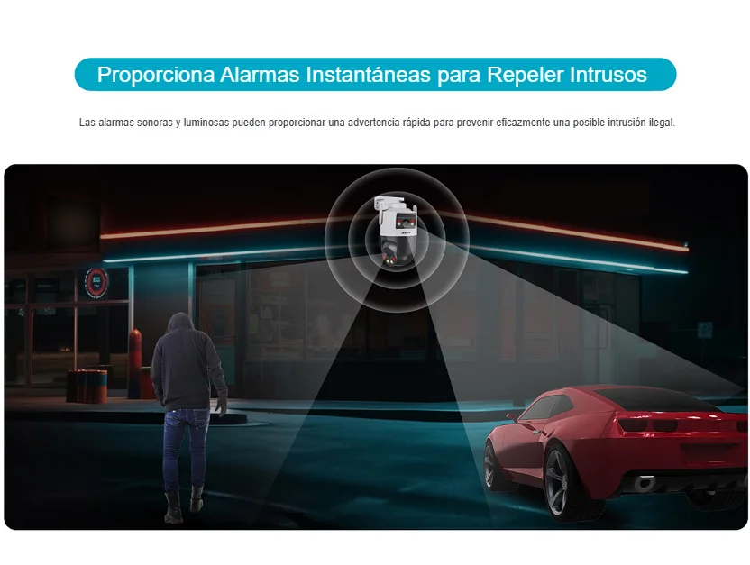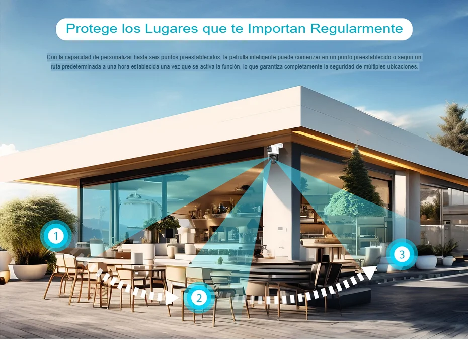 | Características | - Cámara exterior Wi-Fi de doble lente con movimiento panorámico e inclinación de 3+3 MP