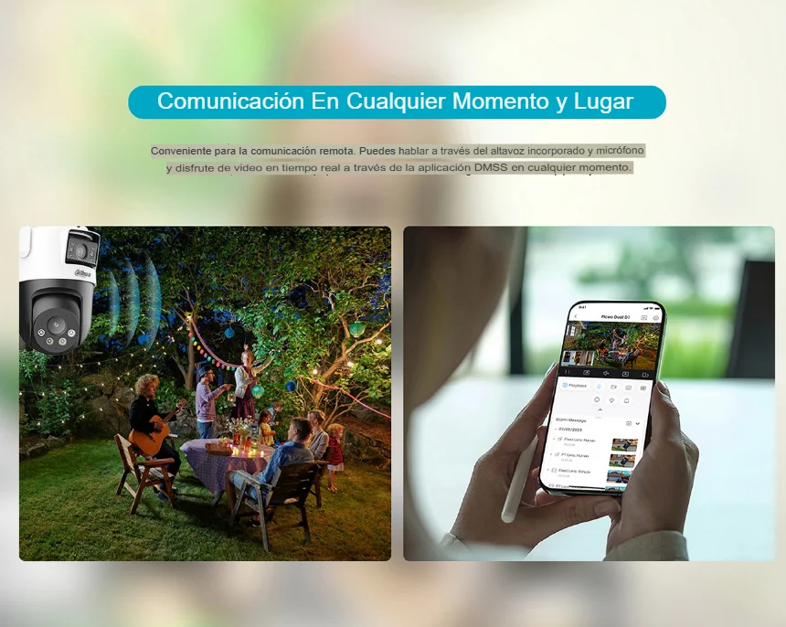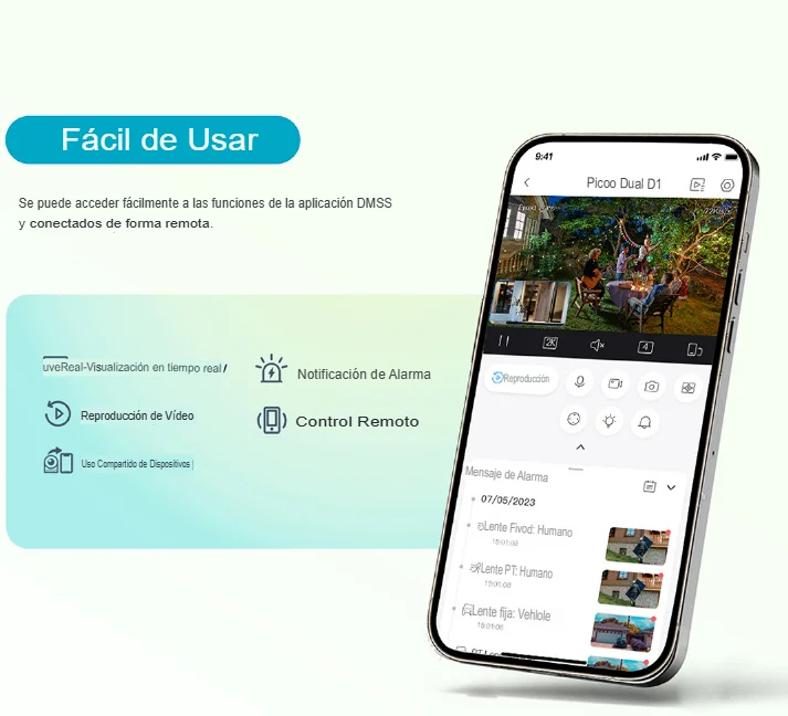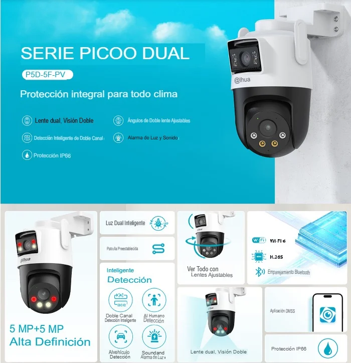 | Características | - Cámara exterior Wi-Fi de doble lente con movimiento panorámico e inclinación de 5+5 MP