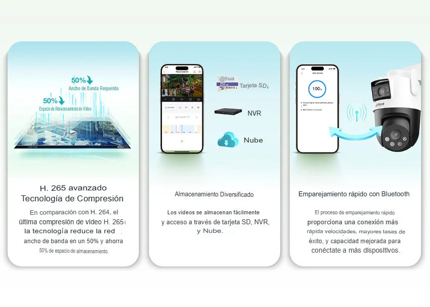 | Red | | Puerto de red | RJ-45 (10/100 Base-T) | | Wi-Fi | IEEE 802.11b/g/n/ax 2.412-2.472 GHz, 2.4G, ≤20 dBm a 2400-2483.5 MHz | | Emparejamiento Wi-Fi | Emparejamiento Bluetooth | | Almacenamiento | Tarjeta Micro SD (admite un máximo de 256 GB) | | Software de gestión | DMSS | | Cliente móvil | iOS;Android | |