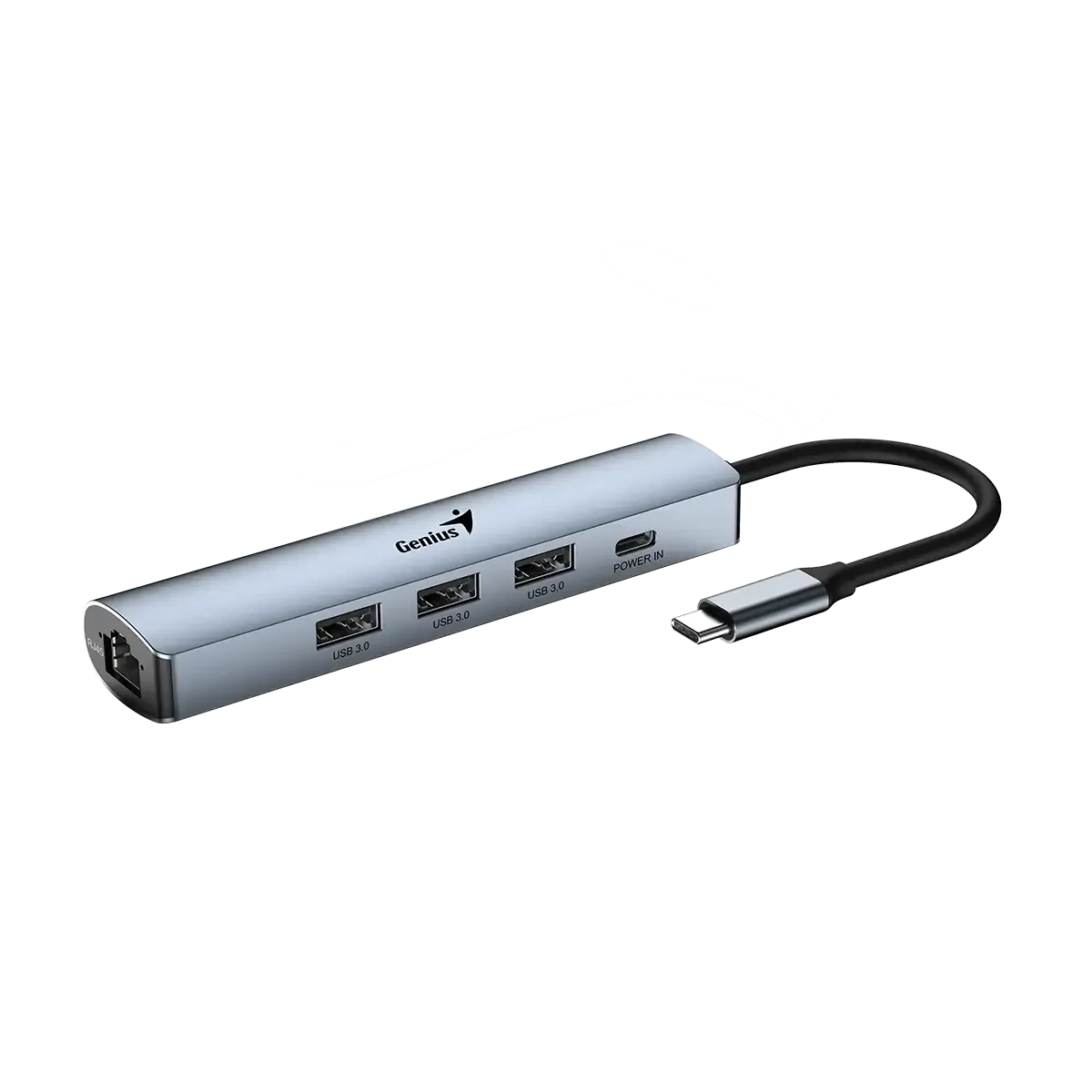 Hub Multipuertos Genius UH-545 5 en 1 / Interfaz: USB-C a 1*Ethernet RJ45 (Gigabit), 3*USB-A 3.0 (datos), 1*USB-C PD (carga) / Compatible: Windows®, Mac OS, Android, Apple IOS / Plug & play |