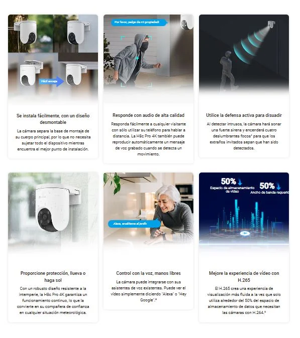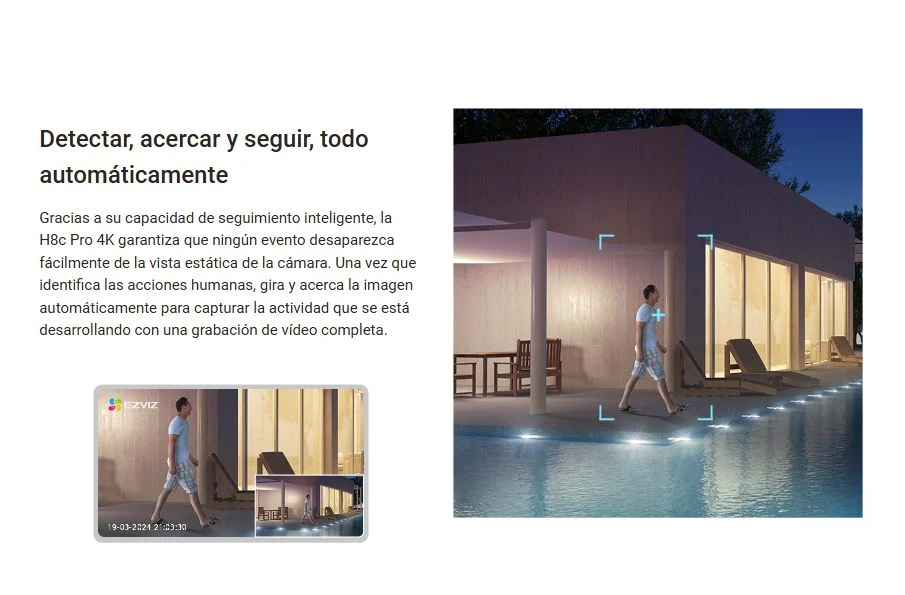 Es hora de actualizar su seguridad exterior con una resolución 4K Ultra HD. Siendo la última incorporación a la familia H8c Pro más vendida, la cámara ofrece detalles impresionantes en 360 grados para reducir drásticamente los puntos ciegos y tener una mayor tranquilidad. Como cámara multifuncional, la H8c Pro no solo eleva su experiencia visual, sino que también protege mejor en exteriores gracias a sus versátiles funciones de detección. Ver, detectar, disuadir, e interactuar fácilmente con una solo H8c Pro. - Resolución de 4K