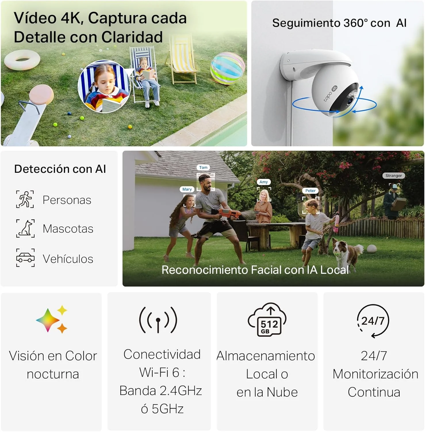 - Opciones de almacenamiento flexibles : elija entre almacenamiento microSD † local de hasta 512 GB o el servicio en la nube seguro Tapo Care ‡ para mayor tranquilidad.