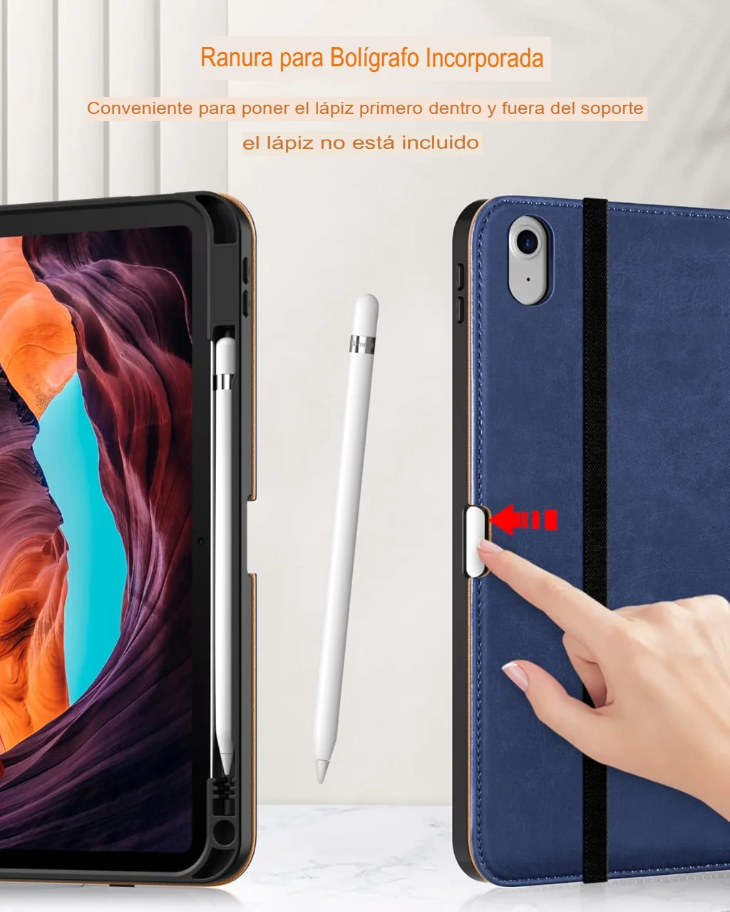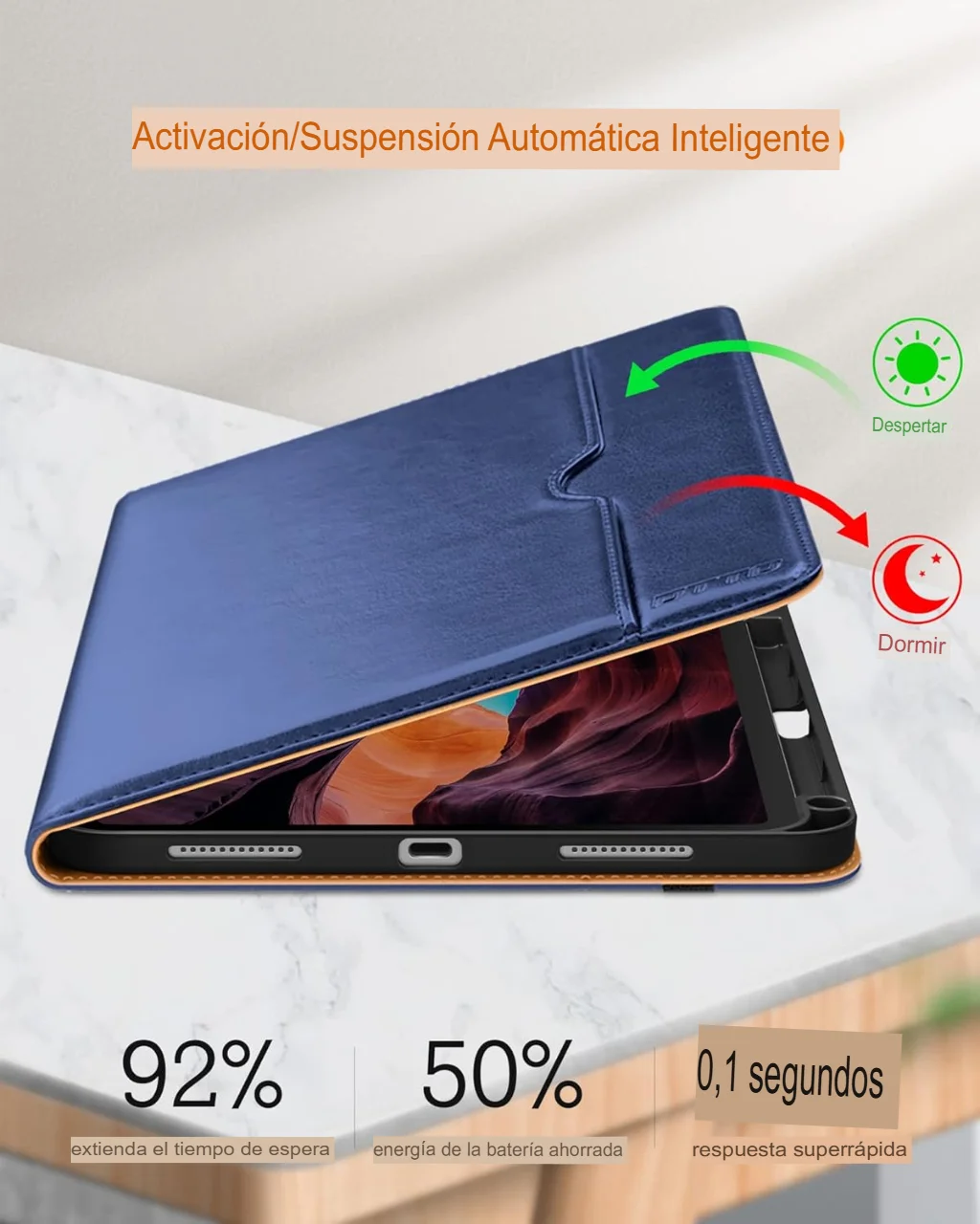 - Funda magnética inteligente: soporta encendido y apagado automático, correa de mano de cuero integrada (operación con una sola mano) y banda elástica externa que mejora el cierre magnético