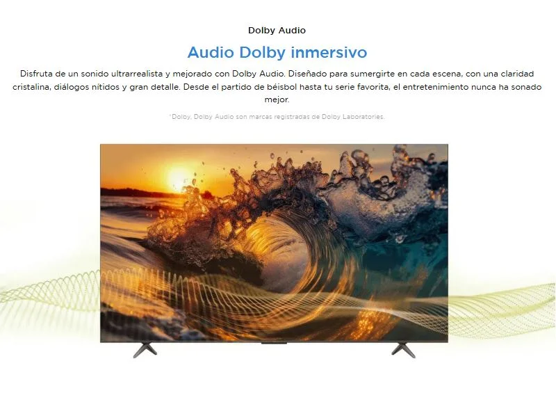 Disfruta de un sonido ultrarrealista y mejorado con Dolby Audio. Diseñado para sumergirte en cada escena, con una claridad cristalina, diálogos nítidos y gran detalle. Desde el partido de béisbol hasta tu serie favorita, el entretenimiento nunca ha sonado mejor.