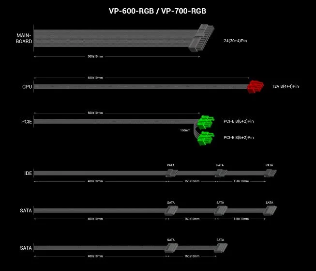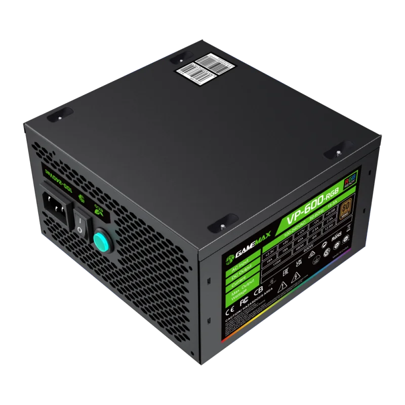 Especificaciones técnicas | 80PLUS | Cumple con APFC 80+ Plus | Nivel de eficiencia | 80+ Bronce | Nivel de ruido | Cero (ECO-ON),<32dba> | Factor de forma | Intel ATX 12 V 2.31 | Dimensiones | 140 mm (ancho) x 150 mm (largo) x 86 mm (alto) | Información para fans | Tamaño del ventilador | 120 milímetros | Control del ventilador | Ventilador ecológico integrado, botón ARGB con función de memoria | Cojinete del ventilador | Cojinete hidráulico | Esperanza de vida | 50.000 horas a 40 °C, 15 % - 65 % HR | Información del cable | Modularidad | Cableado cableado | Tipo de cable | Protector de tubo negro junto con CPU de colores y conector PCIe | Características eléctricas | Temperatura de funcionamiento | 0 - 50 °C (reducción del 100 % al 80 % de 40 °C a 50 °C) | MTBF a 25 °C, sin ventilador | 100.000 horas | Entrada de CA | Entrada de CA de rango completo (100-240 V CA) | Protección | OPP/OVP/UVP/OCP/SCP /OTP/NLP/SIP/OLP/NLO | Seguridad y medio ambiente | Seguridad y EMC | CB, CCC, CE | Cumplimiento ambiental | RoHS, WEEE, ErP Lote 6 | |