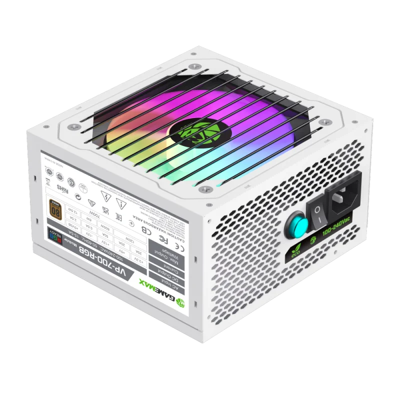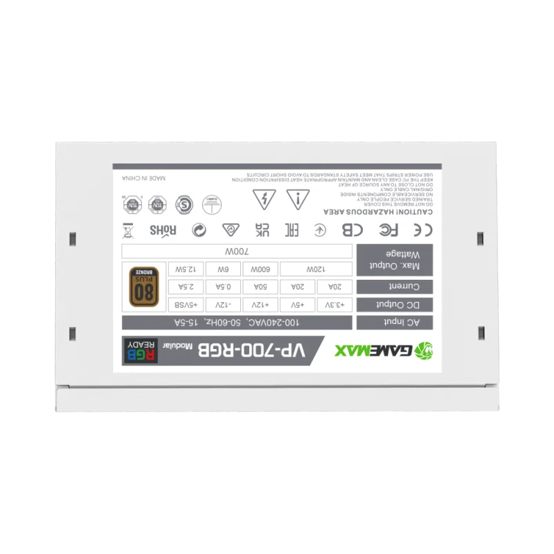 Especificaciones técnicas | 80PLUS | Cumple con APFC 80+ Plus | Nivel de eficiencia | 80+ Bronce | Nivel de ruido | Cero (ECO-ON),<32dba> | Factor de forma | Intel ATX 12 V 2.31 | Dimensiones | 140 mm (ancho) x 150 mm (largo) x 86 mm (alto) | Información para fans | Tamaño del ventilador | 120 milímetros | Control del ventilador | Ventilador ecológico integrado, botón ARGB con función de memoria | Cojinete del ventilador | Cojinete hidráulico | Esperanza de vida | 50.000 horas a 40 °C, 15 % - 65 % de humedad relativa | Información del cable | Modularidad | Cableado cableado | Tipo de cable | Cables blancos | Características eléctricas | Temperatura de funcionamiento | 0 - 50 °C (reducción del 100 % al 80 % de 40 °C a 50 °C) | MTBF a 25 °C, sin ventilador | 100.000 horas | Entrada de CA | Entrada de CA de rango completo (100-240 V CA) | Protección | OPP/OVP/UVP/OCP/SCP/OTP /NLP/SIP/OLP/NLO | Seguridad y medio ambiente | Seguridad y EMC | CB, FCC, CE | Cumplimiento ambiental | RoHS, WEEE, ErP Lote 6 | |
