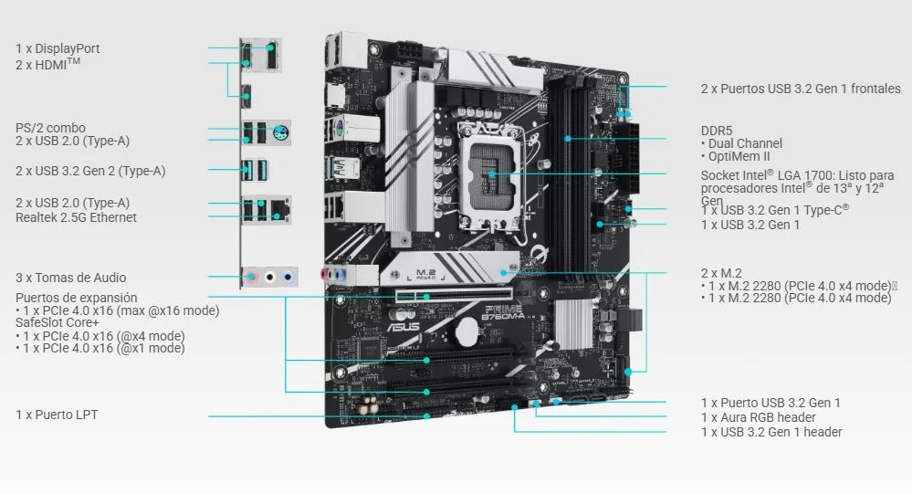 Procesadores Intel de 13ª y 12ª generación Ranura M.2_1 (Clave M), tipo 2242/2260/2280 (admite modo PCIe 4.0 x4) Chipset Intel B760 Ranura M.2_2 (clave M), tipo 2242/2260/2280 (admite modo PCIe 4.0 x4) 4 x puertos SATA 6 Gb/s |
