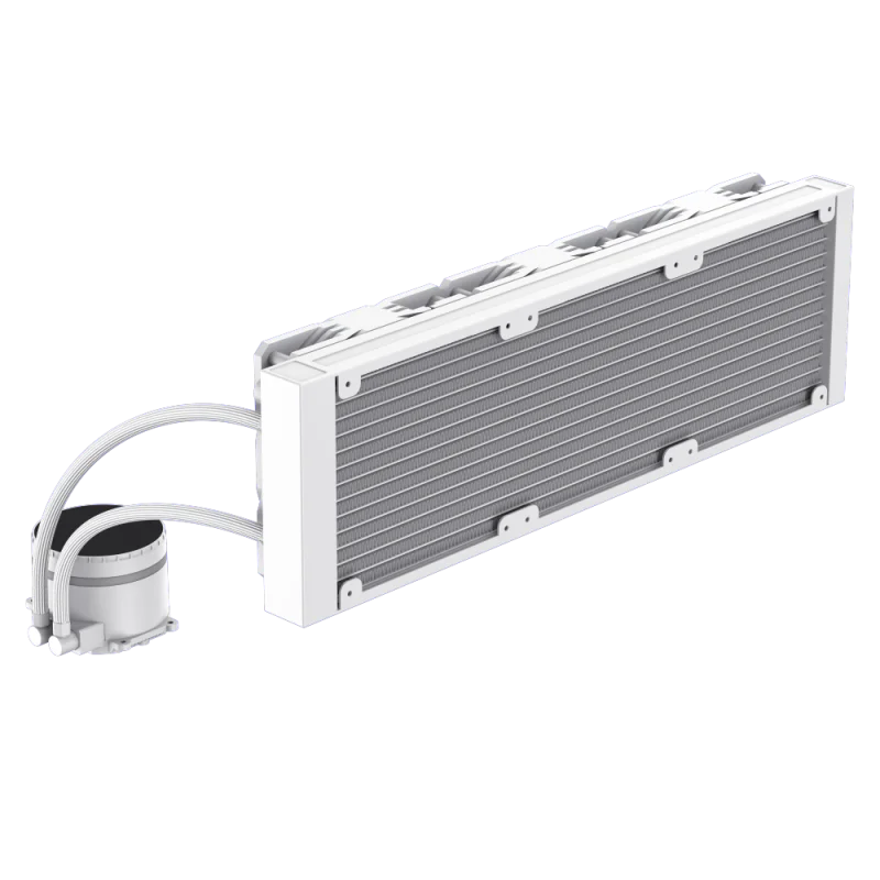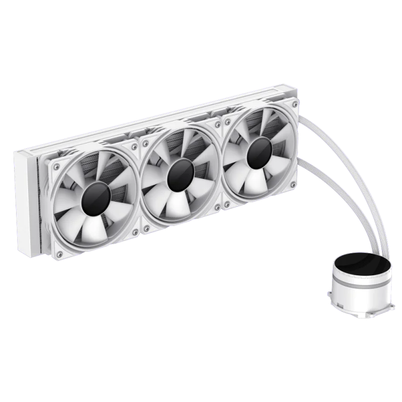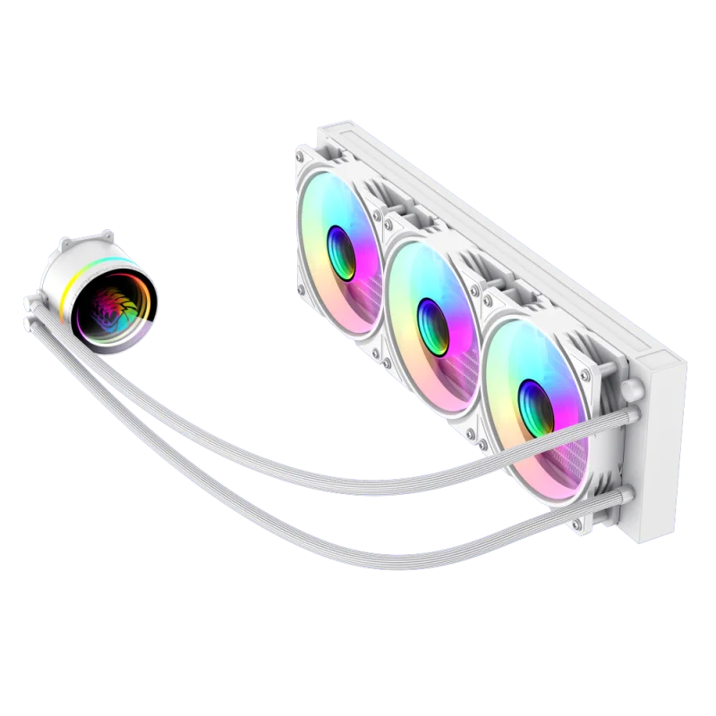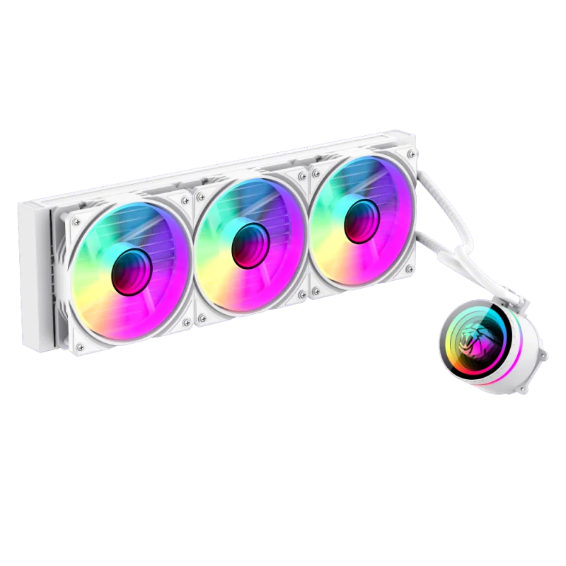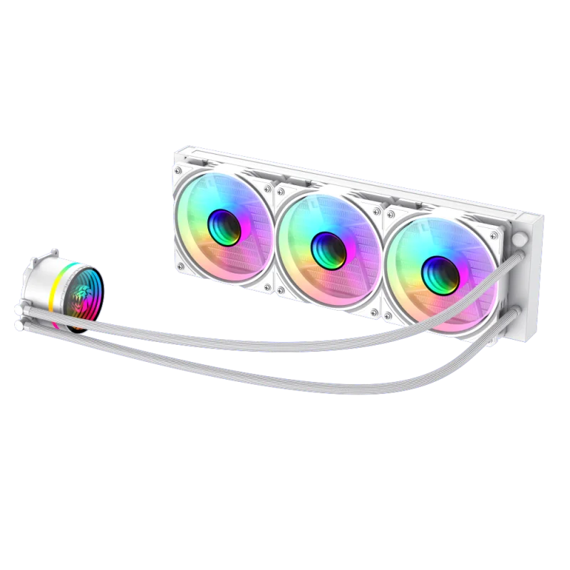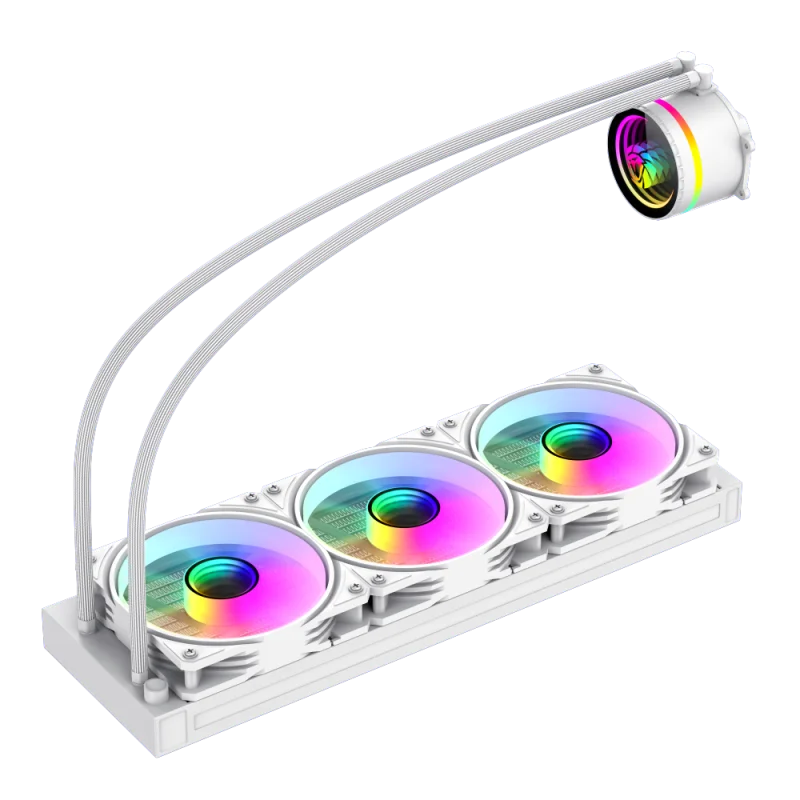 - VENTILADORES ARGB TRIPLES: 3 ventiladores ARGB PWM de 120 mm brindan una excelente presión y flujo de aire al tiempo que generan muy poco ruido. (Nota: El modo PWM debe configurarse en BOIS antes del funcionamiento del enfriador líquido; de lo contrario, el ventilador funcionará a una velocidad fija de velocidad completa o baja velocidad)