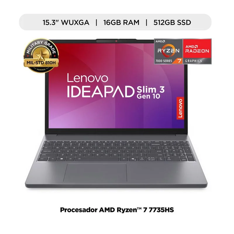 LENOVO IdeaPad Slim 3 15ARP10 / AMD Ryzen™ 7 7735HS (8 núcleos/16 subprocesos, hasta 4,7 GHz) / 16GB DDR5 / 512GB PCIe® 4.0x4 NVMe® SSD / 15.3" WUXGA (1920 x 1200), IPS / Sin Sistema (OS) / Wi-Fi® 6 2x2 + BT5.3 / Teclado Español alfanumérico / Luna Grey |