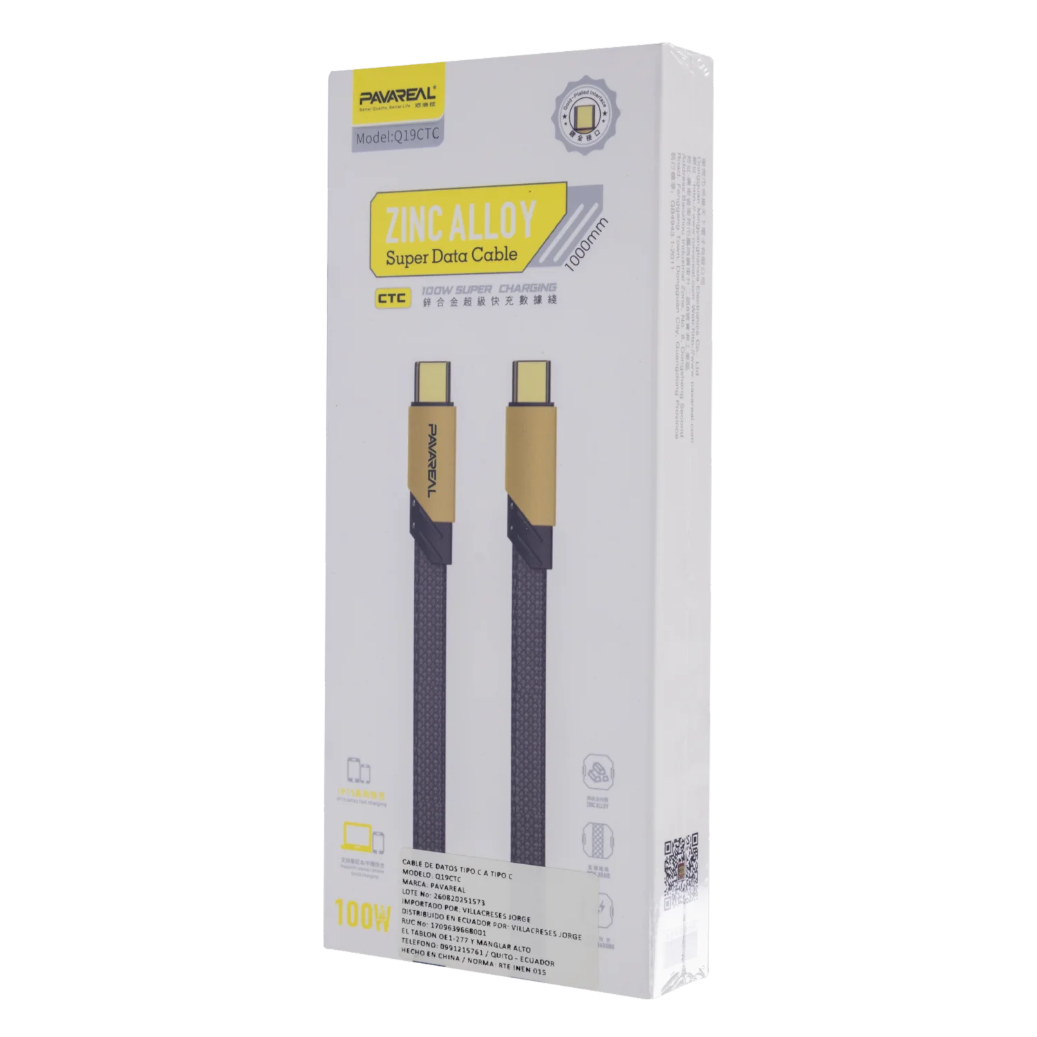 Cable de Datos Pavareal Q19CTC USB-C a USB-C / 100W, PD27 W / 1 m / Trenzado plano Negro/Amarillo