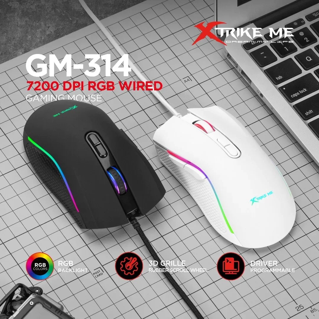 Mouse XTRIKE-ME GM-314 BK / 7200 DPI / Driver Programable / Iluminación RGB (efectos dinamicos) / USB, Cable:1.5 mt. / 7 botones / blanco