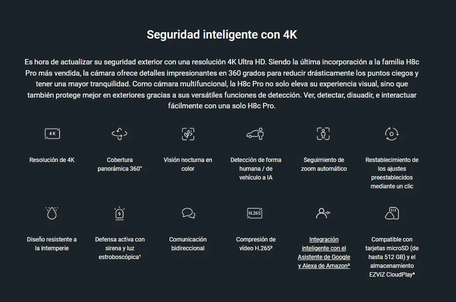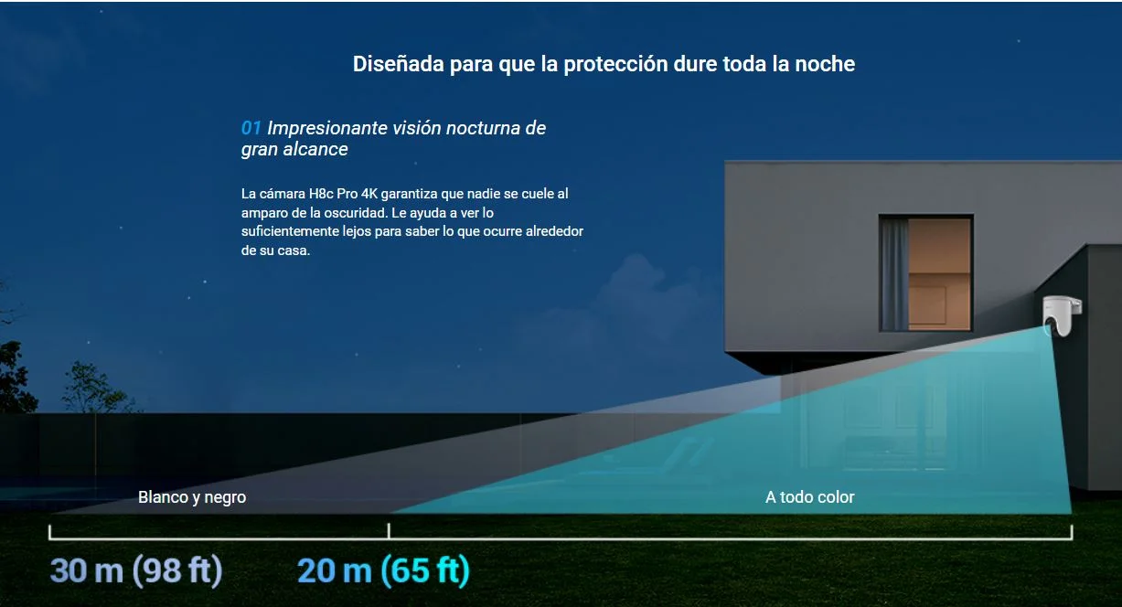 Es hora de actualizar su seguridad exterior con una resolución 4K Ultra HD. Siendo la última incorporación a la familia H8c Pro más vendida, la cámara ofrece detalles impresionantes en 360 grados para reducir drásticamente los puntos ciegos y tener una mayor tranquilidad. Como cámara multifuncional, la H8c Pro no solo eleva su experiencia visual, sino que también protege mejor en exteriores gracias a sus versátiles funciones de detección. Ver, detectar, disuadir, e interactuar fácilmente con una solo H8c Pro. - Resolución de 4K