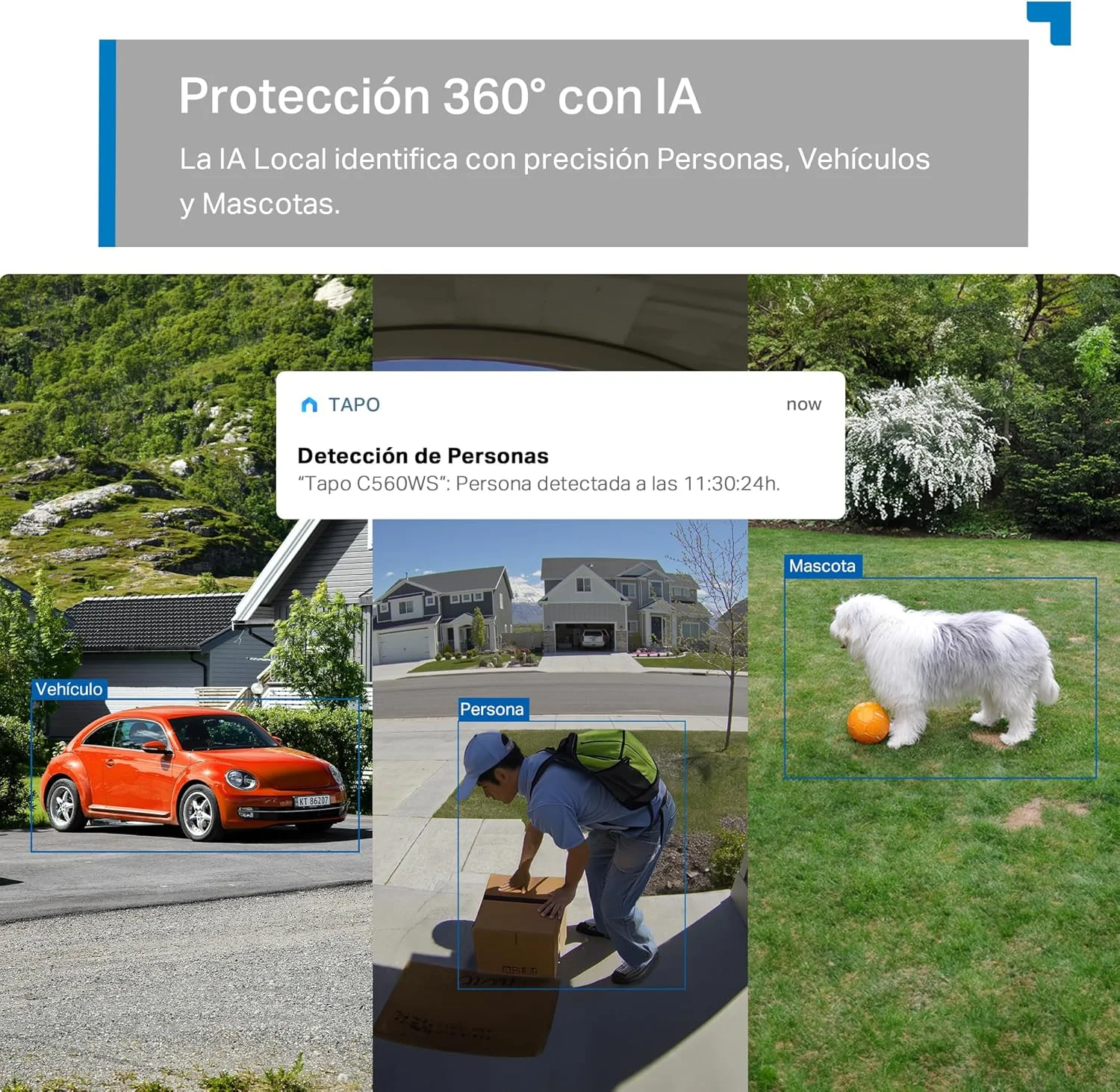 | Detección y notificaciones | | Detección de IA | Detección de rostros humanos Detección de movimiento Detección de personas Detección de mascotas Detección de vehículos Detección de cruce de línea Manipulación de cámaras | | Zonas de actividad | Sí | | Notificación de salida | Notificación del sistema Notificación del sistema con instantáneas (Servicios Tapo Care) | |