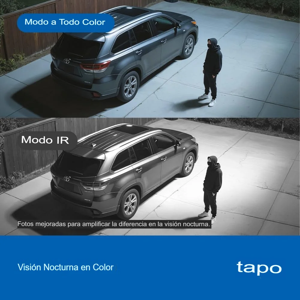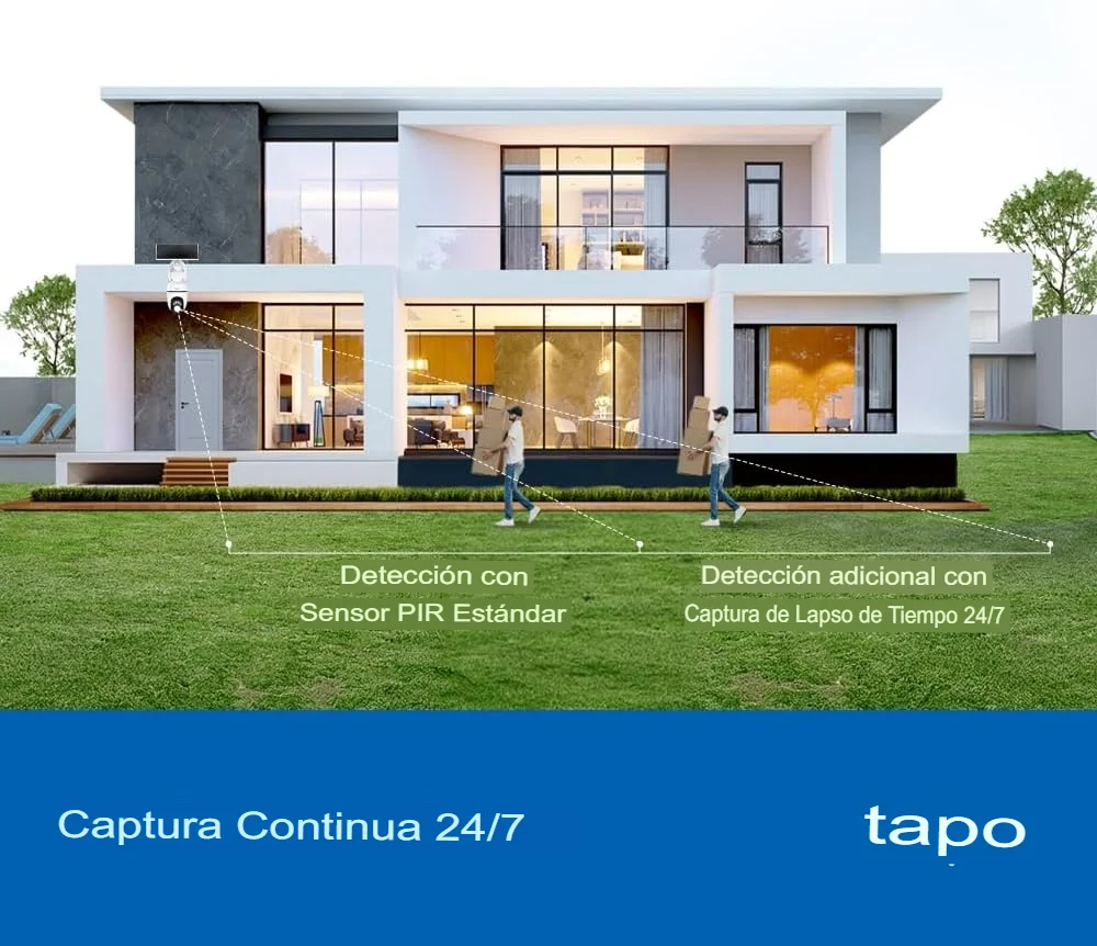 | DETECCIÓN y NOTIFICACIONES | | Sensor | Sensores de movimiento y sensores de luz ambiental | | Detección mediante IA | Detección de movimiento, detección de personas, detección de vehículos, detección de mascotas | | Zonas de actividad | Sí | | Notificación de salida | Notificación del sistema Notificación del sistema con instantánea (Servicios Tapo Care) | |