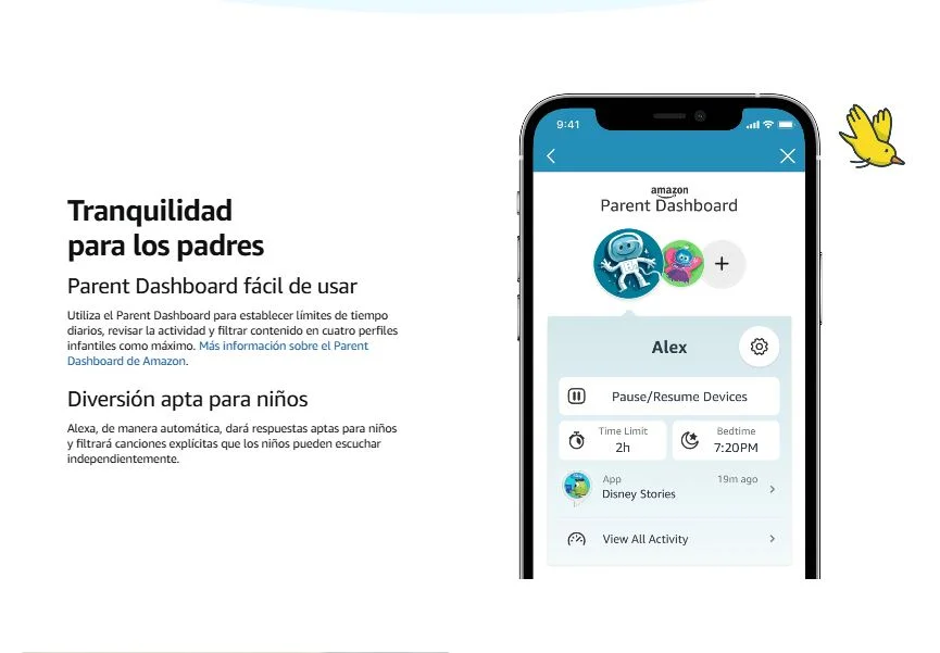 - Controles parentales fáciles de usar – Alexa dará respuestas aptas para niños automáticamente y filtrará las canciones explícitas. También puedes establecer límites de tiempo diarios y revisar la actividad en el Parent Dashboard de Amazon.